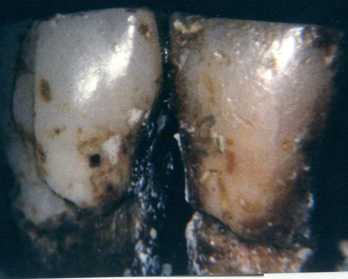 La Ferrassie I adult Neanderthal from France, anterior dentition. I took this photo in 1979 in the MusÈe de l’Homme, Paris. Notice the extremely worn teeth (1,2.3, upper & lower) with reverse wear on the upper incisors perhaps indicating a habitual pattern of clenching a tough fibrous substance between the front teeth and pulling it upward. The same type of task may have been accomplished with the lower incisors except with a downward force applied, since they have a reverse wear pattern as well. This is called occlusal attrition ordinarily, but with normal occlusal attrition the teeth grind against each other a certain percentage of the time and so have a closer occlusion (contact) or bite (better fit). These anterior teeth have almost no fit and expose the practice of a destructive habit with a foreign object.. |