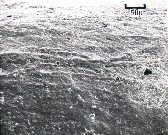 Scanned (SEM) labial Surface of the most unworn incisor tooth surface in the Mt Carmel collection of Harvard Peabody Museum. I made a cast of this upper central incisor using accurate silicone-based dental impression material and following the procedure recommended by Dean and Bromage in a personal communication to Dr. S. Koepp. The random elevated linear structures are the perikymata. |